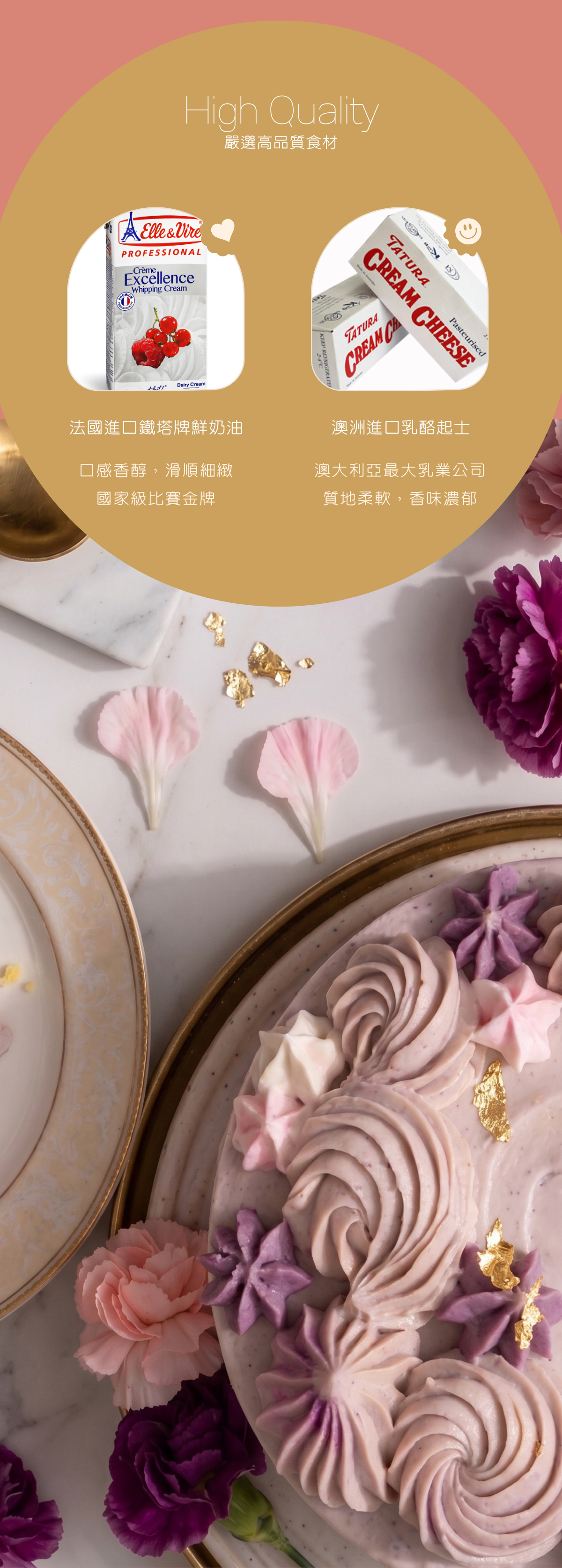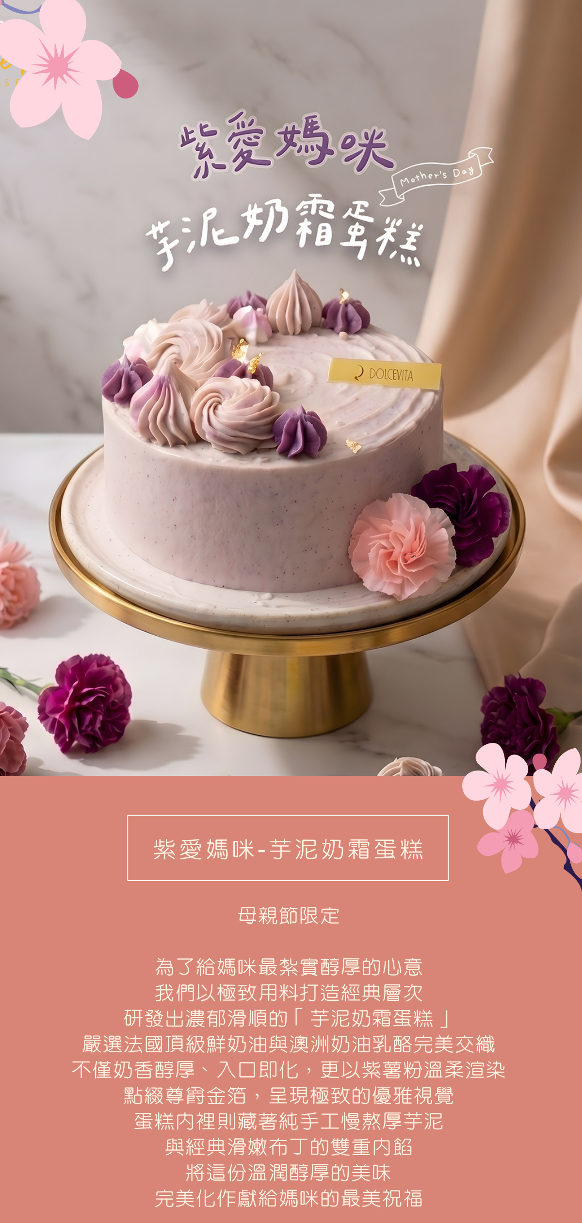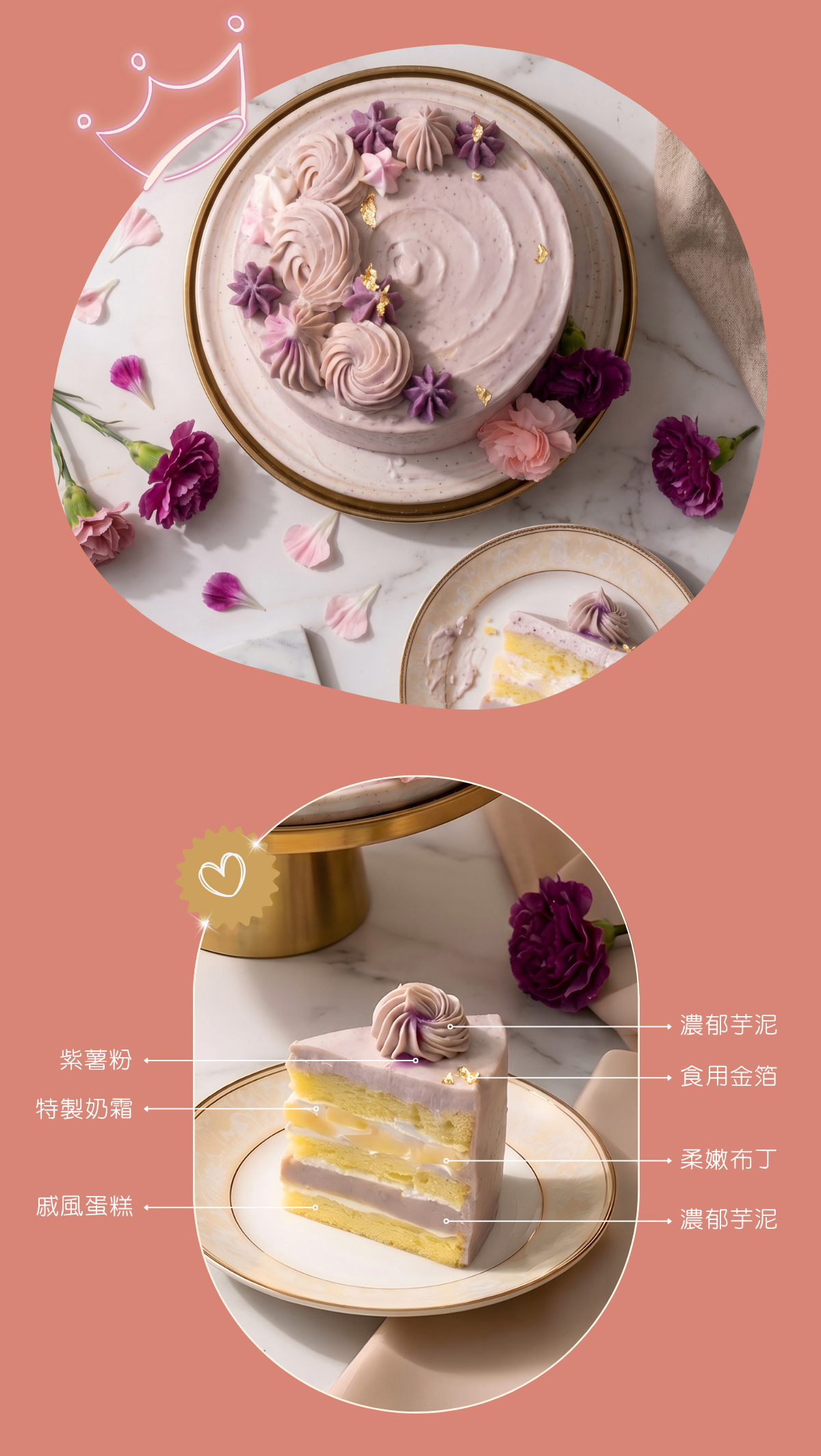 2026 母親節限定!為了給媽咪最紮實醇厚的心意,我們以極致用料打造經典層次。獨家研發濃郁滑順的「芋香乳酪奶霜」,嚴選法國頂級鮮奶油與澳洲奶油乳酪完美交織,帶來奶香醇厚、入口即化的極致口感。外觀以紫薯粉溫柔渲染,點綴尊爵金箔,呈現高貴的優雅視覺;蛋糕內裡則藏著純手工慢熬厚芋泥與經典滑嫩布丁的雙重內餡。將這份溫潤醇厚的頂級美味,完美化作獻給媽咪的最美祝福。