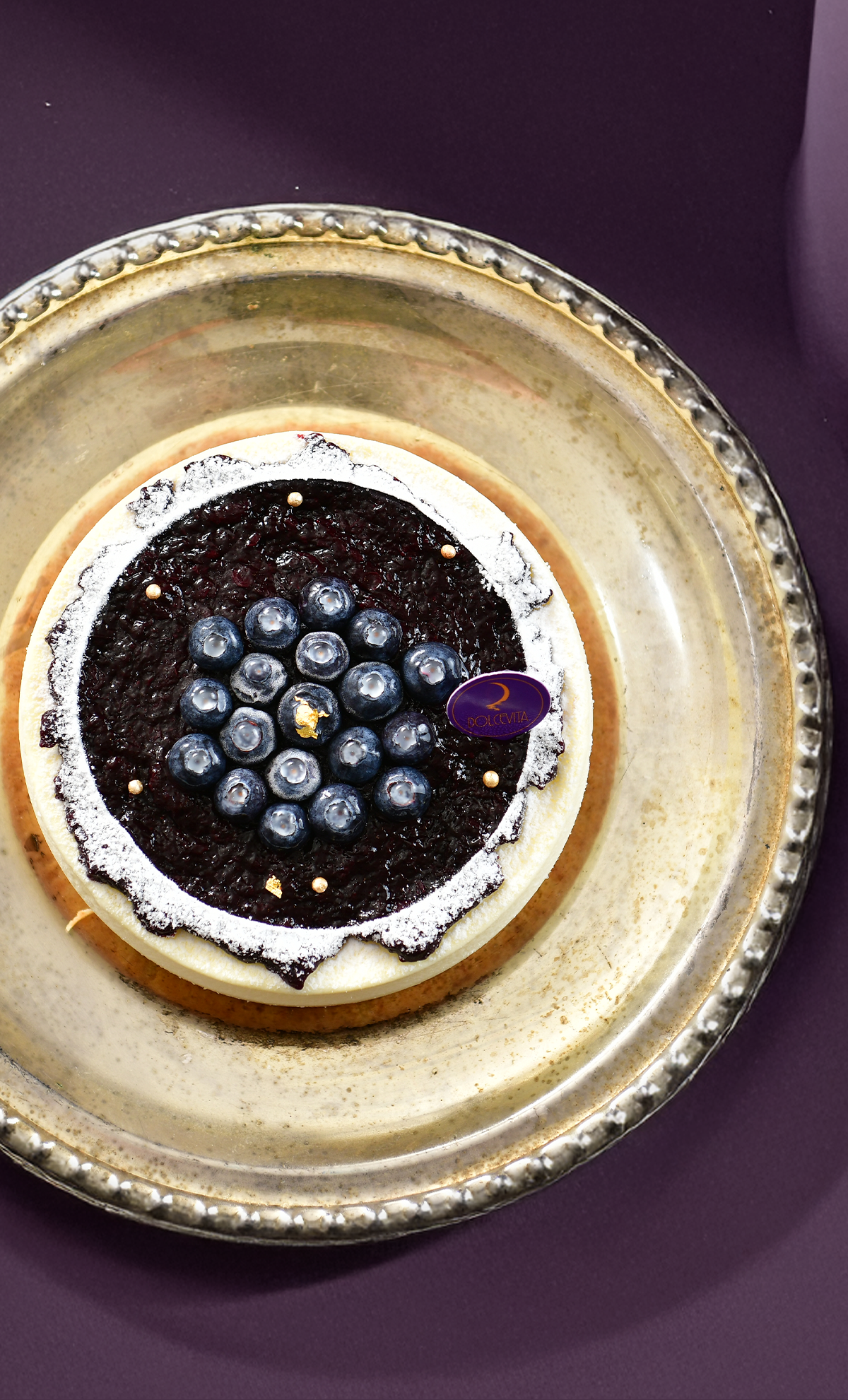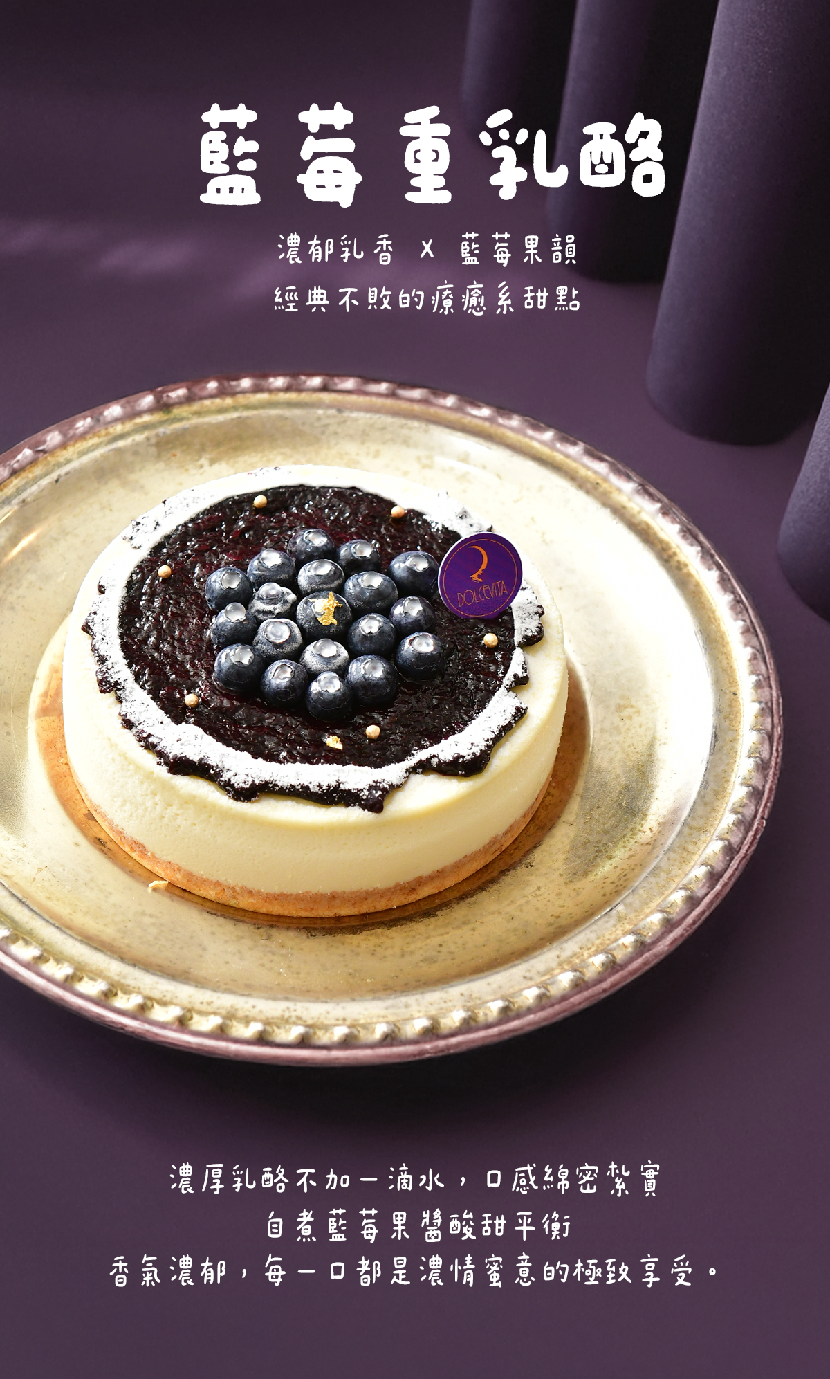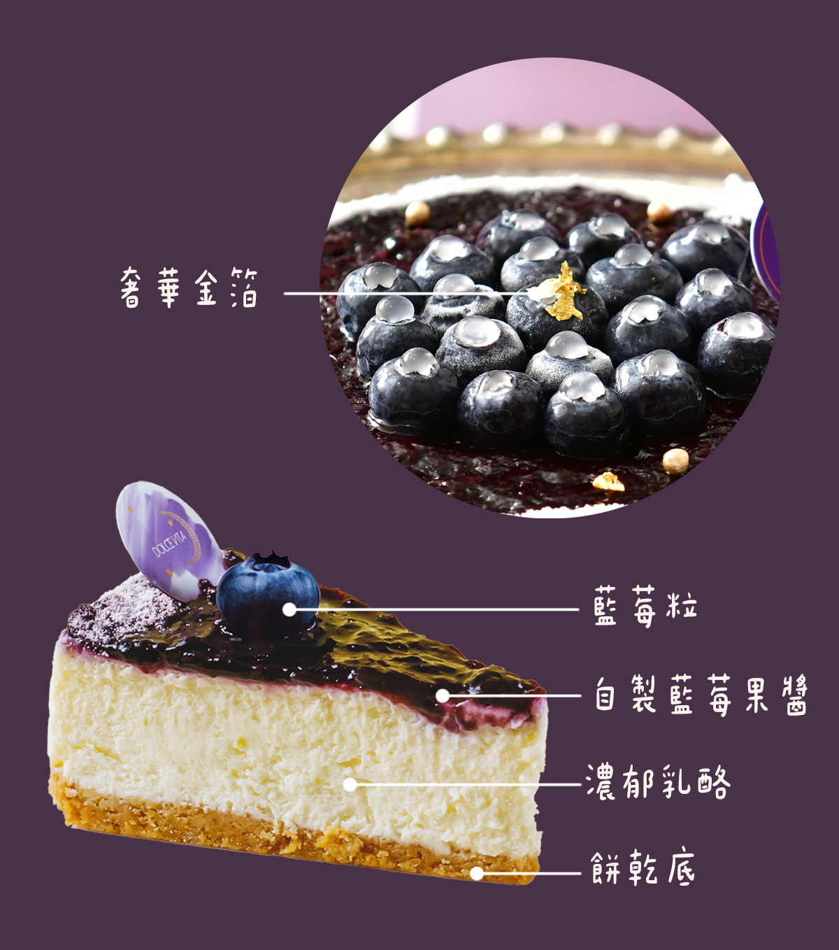 成分:澳洲進口乳酪、鮮奶油、無鹽奶油、雞蛋、糖、杏仁粉、麵粉、藍莓、巧克力珠、食用金箔