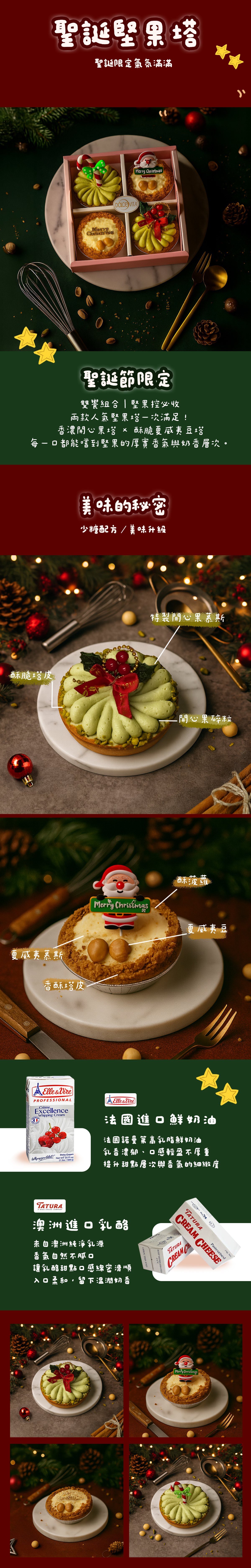 這盒四入組集結兩款人氣堅果塔,綠金色調與聖誕裝飾完美呼應,無論送禮或犒賞自己,都充滿儀式感。