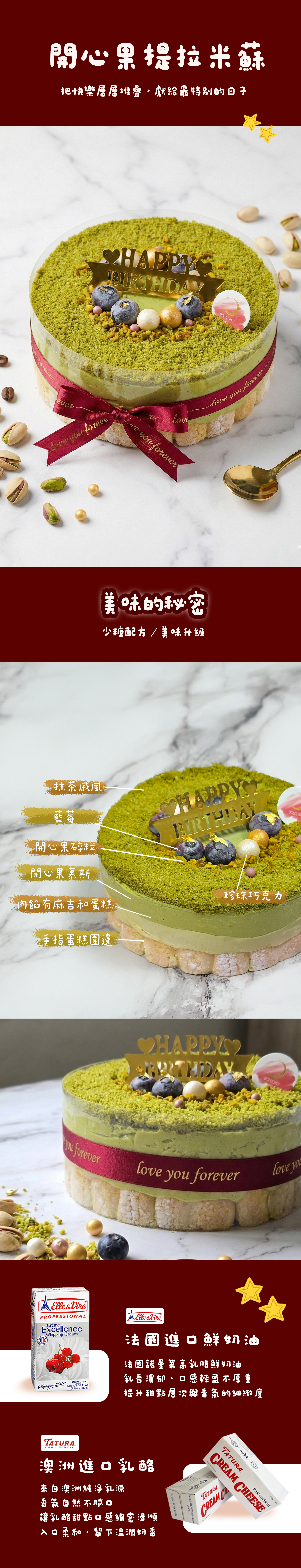 濃郁開心果結合柔滑提拉米蘇層次,手指餅乾環繞成型,口感濕潤平衡。