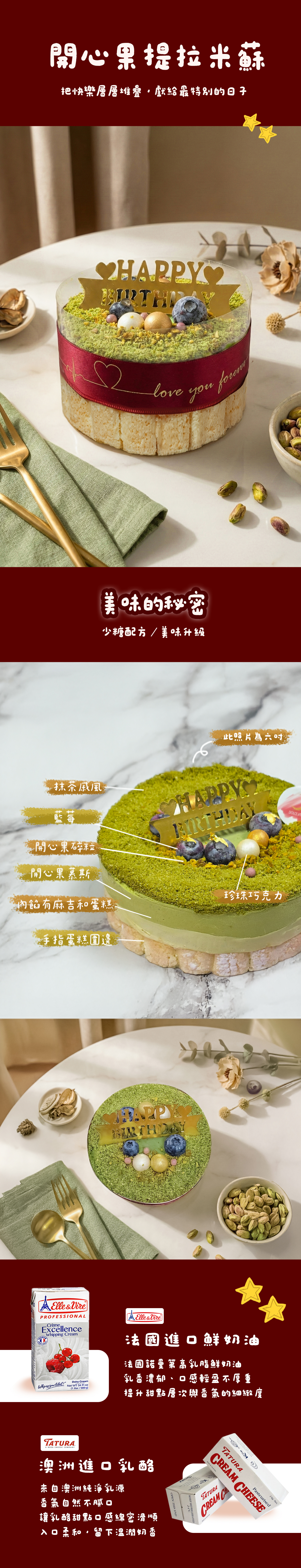 濃郁開心果結合柔滑提拉米蘇層次,手指餅乾環繞成型,口感濕潤平衡。