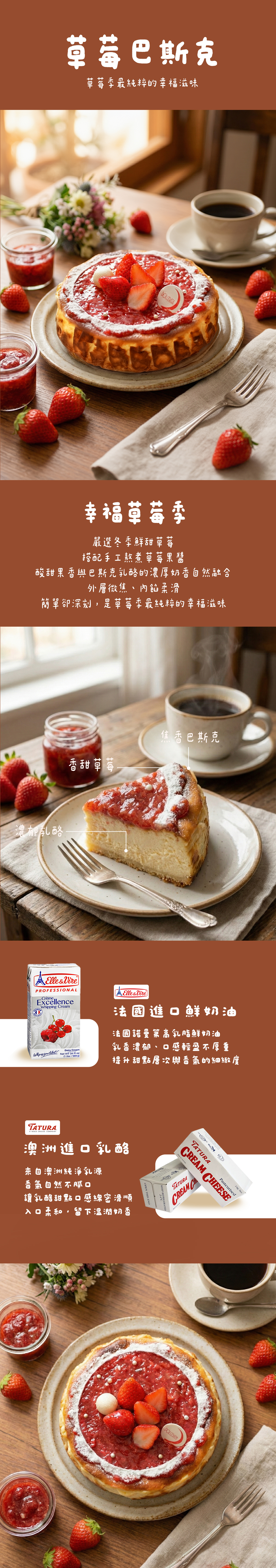 嚴選冬季最鮮豔的大湖草莓,搭配手工慢火熬煮的草莓果醬,酸甜果香與巴斯克乳酪的濃厚奶香自然交融。