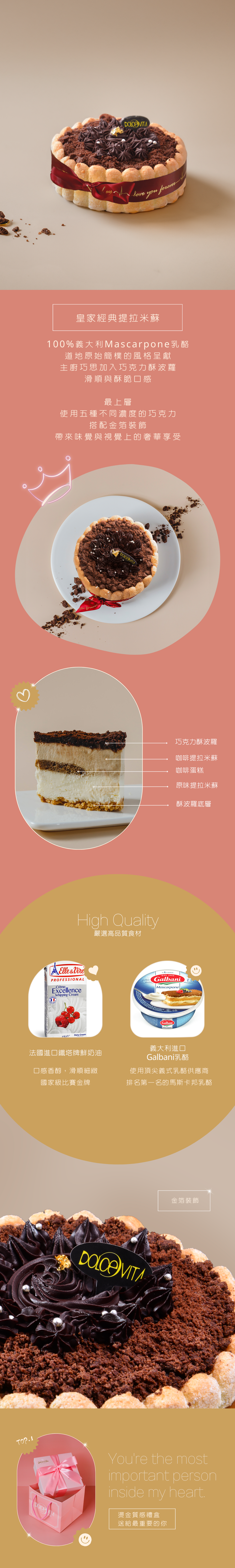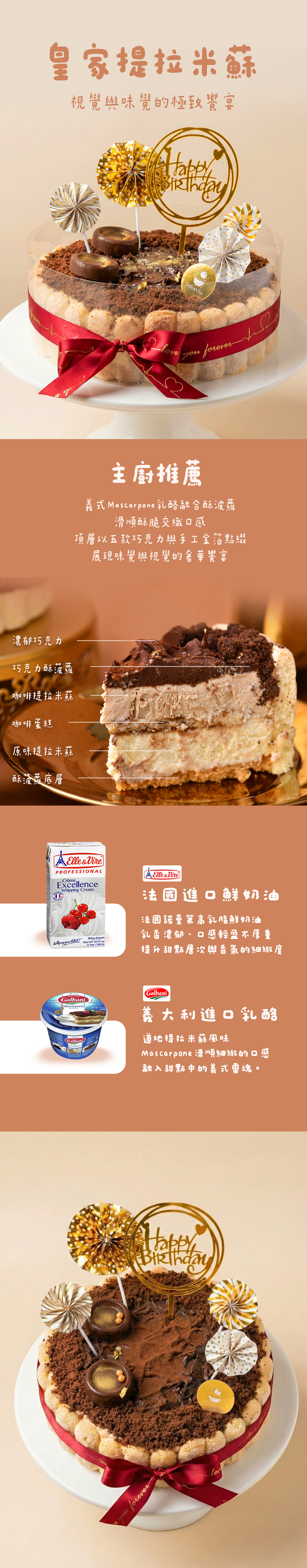 成分:法國進口鮮奶油、義大利進口乳酪、雞蛋、糖、杏仁粉、麵粉、可可粉、香草莢、杏仁酒、巧克力、食用金箔、巧克力珠、榛果醬、椰子粉、無鹽奶油、鹽