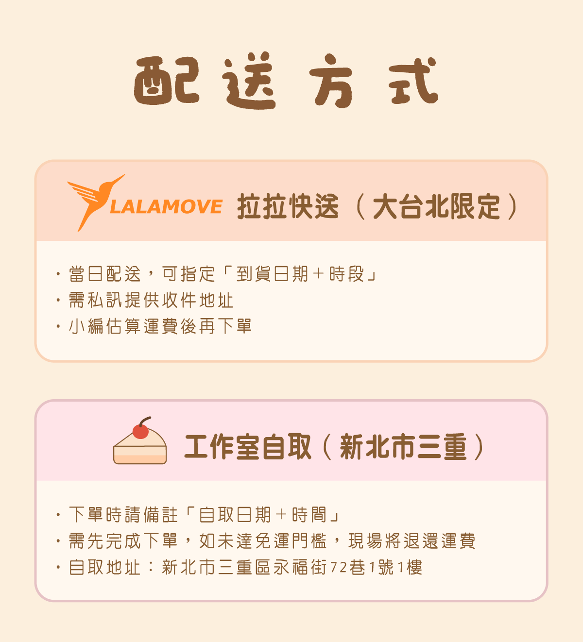 3.宅配過程偶有蛋糕位移或裝飾掉落等問題,主題架構微損,均不在毀壞補償範圍內。
