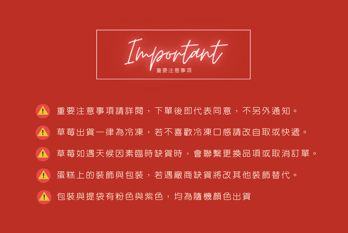 5.蛋糕如嚴重受損請在第一時間內拍照存證,並請立即與我們聯絡。