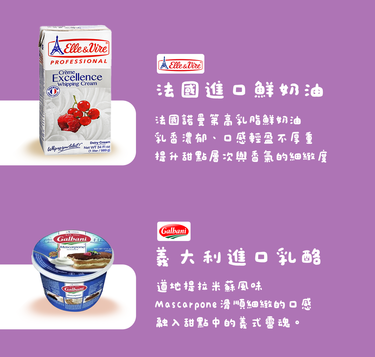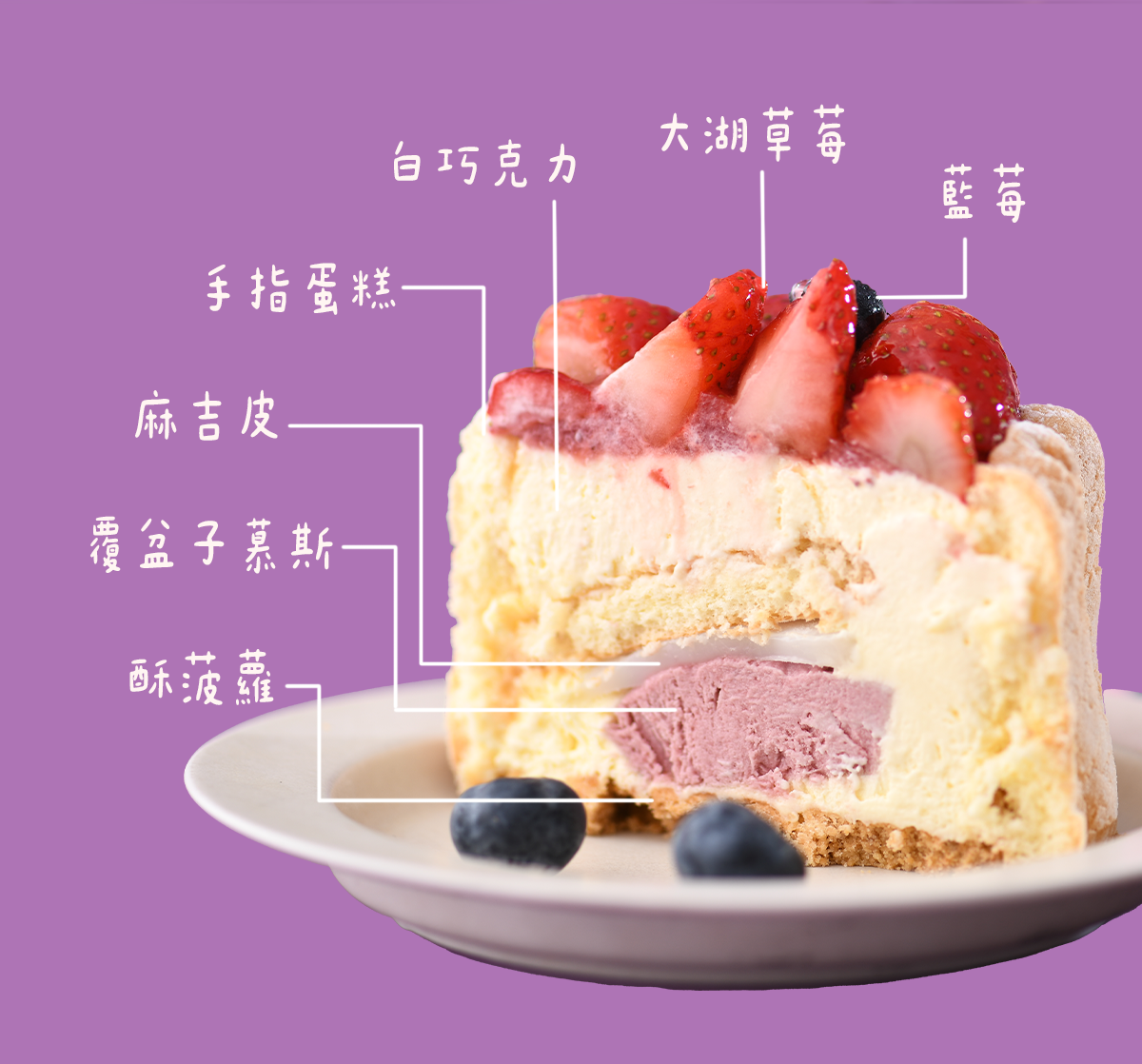 成分:法國進口鮮奶油、澳洲進口乳酪、雞蛋、糖、杏仁粉、麵粉、覆盆子、橙酒、白巧克力、寒天、麻吉、食用色素、榛果醬、椰子粉、無鹽奶油、鹽、草莓、藍莓